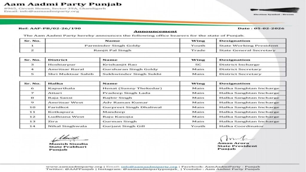 आम आदमी पार्टी (आप) पंजाब ने संगठनात्मक ढांचे को और सशक्त करने के उद्देश्य से विभिन्न विंगों में नए पदाधिकारियों की नियुक्ति की है। इन नियुक्तियों से राज्य के ज़िलों और विधानसभा क्षेत्रों में पार्टी की पकड़ और मज़बूत होने की उम्मीद है।
